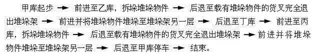 (作業(yè)要點(diǎn):加油提升,倒車貨叉要后傾要提升,丁庫(kù)放叉)